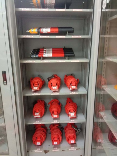 如上圖,安全工具柜共分為5個橫隔層,其中上面兩層存儲個人保安線,中間有個豎隔層。下面兩層是用于存放腳扣所用。中間一層本為自由使用,現也根據實際需求用于存儲個人保安線。細心的人可以看到在安全工器具前面都貼有標簽,包含產品的名稱、編號、數量等。