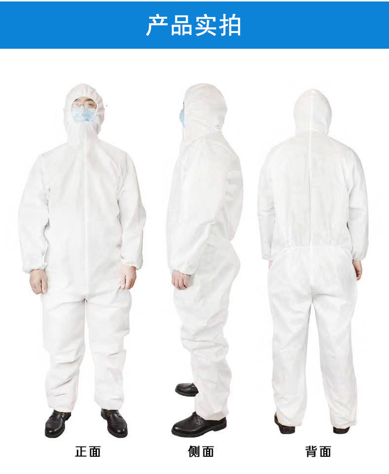 防護(hù)服由連帽上衣、褲子組成,分為連身式結(jié)構(gòu)和分身式結(jié)構(gòu)。防護(hù)服的結(jié)合部位應(yīng)嚴(yán)密。袖口、腳踝口采用彈性收口,帽子面部收口及腰部采用彈性收口、拉繩收口或搭扣。產(chǎn)品性能:防護(hù)服透濕量應(yīng)不小于2500g/(m2?d),防護(hù)服對(duì)非油性顆粒物的過(guò)濾效率不小于70%,防護(hù)服帶電量應(yīng)不大于0.6μC。其它性能指標(biāo)詳見注冊(cè)產(chǎn)品標(biāo)準(zhǔn)《一次性醫(yī)用防護(hù)服》。